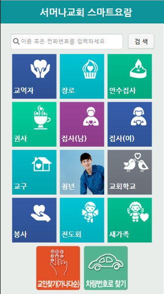 교역자, 장로, 권사, 집사 및 구역장(목자), 교사 등 모든 성도들의 요람을 스마트폰에서 확인하실 수 있는 스마트폰용 어플리케이션입니다.