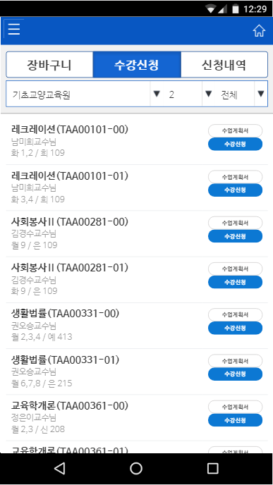 5. 수강 시스템: 학사 일정 (장바구니 수강 신청، 수강 신청، 계절 학기 수강 신청) 에 따른 수강 신청 진행 및 수강 내역، 강의 계획서 조회