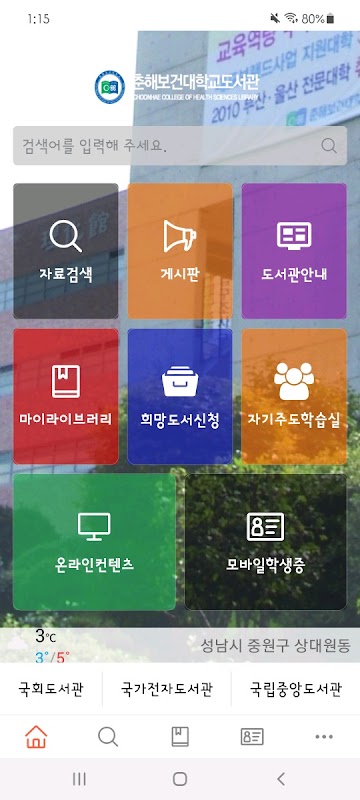 chunhae المعلومات الصحية قرض الكلية وكتاب التحقيق المعلومات من المكتبة، على أمل تطبيق المحمول لالروبوت التي يمكن تطبيقها للكتب.