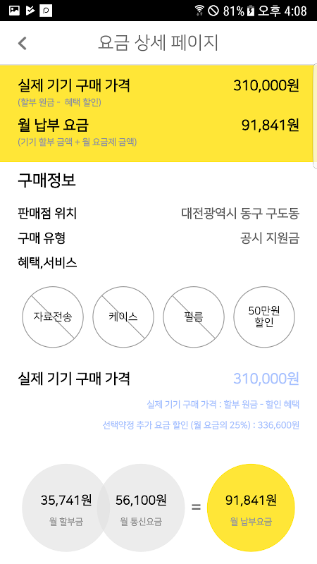 혜택, 거리, 요금제 유지기간, 부가서비스 유지기간, 서비스(자료전송, 케이스, 필름) 등을 구매자가 직접 비교하고 선택합니다.