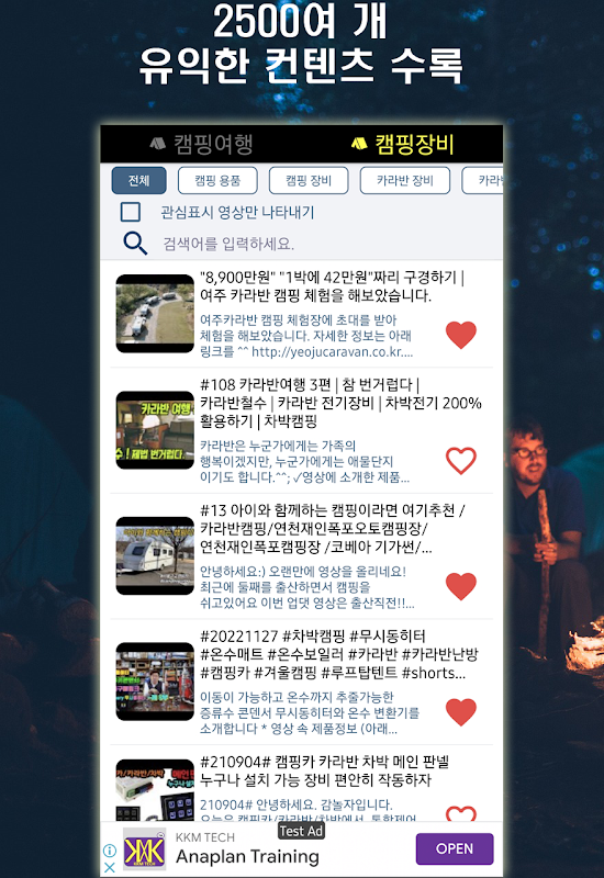 캠핑 에 필요한 장비 ، 캠핑 장 추천 등 부가 정보 까지 총 2500 개의 유용한 컨텐츠 를 담았 습니다.