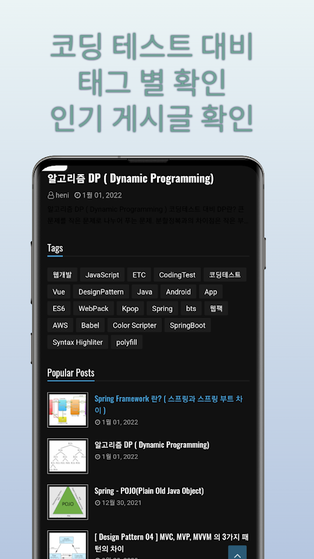 إنها خدمة بسيطة تدمج كل شيء عن الترميز ، والتطوير ، وتطوير الويب ، و JavaScript ، و VUE JS ، و React JS ، واختبار الترميز Baekjun. ذات الصلة بحزمة الويب المعيارية المجمعة. تطبيق يعلمك بالمعلومات الأساسية المطلوبة لتطوير الواجهة الأمامية.