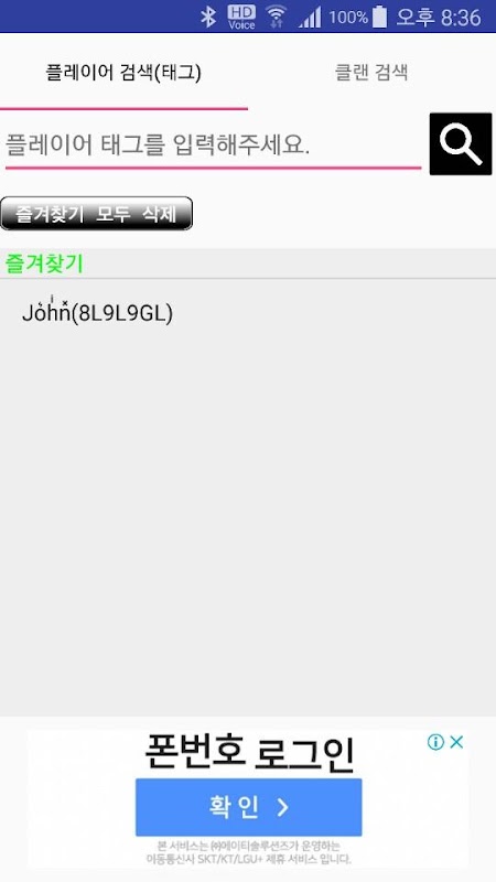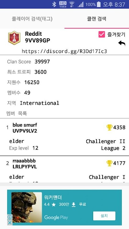 클랜 이름을 검색하여 클랜 정보와 멤버 목록을 확인 가능합니다.