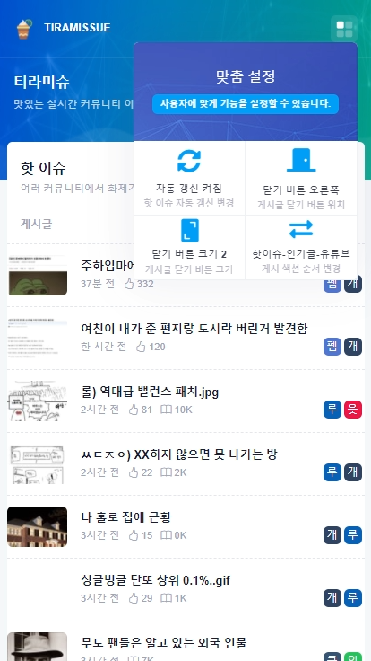 핫 이슈, 커뮤니티 인기글, 유튜브 인기 영상 색션이 있으며 사용자에 맞게 기능을 설정할 수 있는 맞춤 설정 기능이 있습니다.