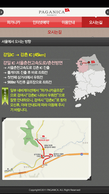 특히 "파가니카"는 코스와 풍광이 자연스럽게 어우러진 친환경 골프장으로 강촌IC 바로 옆에 위치하고 있어 강남에서 40분 정도면 드넓게 펼쳐진 페어웨이를 큰 부담없이 즐기실 수 있습니다.