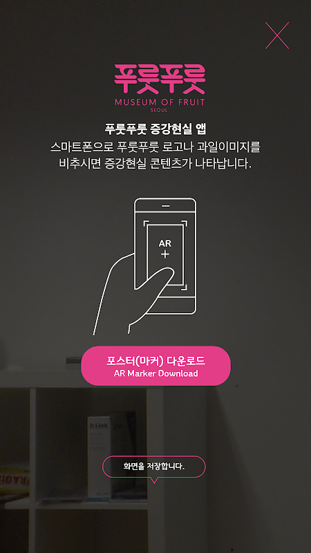 앱을 실행시키고 전시장 내에 설치된 푸룻푸룻 로고를 비추면 다양한 과일 캐릭터가 나타납니다.