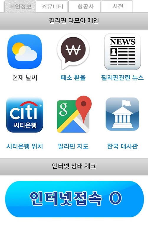 그래서 아예 자주 보는 필리핀 날씨, 페소 환율, 뉴스, ,지도, 시티은행 위치 검색등 을 메인에서 아이콘만 클