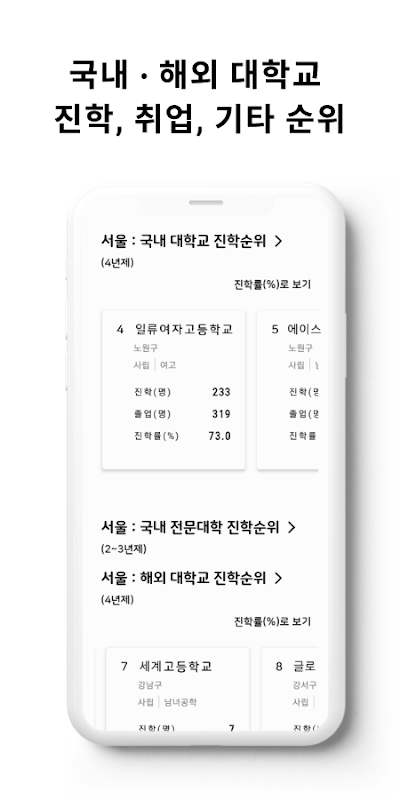 يمكنك التحقق من القبول والترتيب الوظيفي لكل من المدارس المتوسطة والثانوية على الصعيد الوطني وفي 18 منطقة بما في ذلك سيول وبوسان ودايجو وإنشيون.