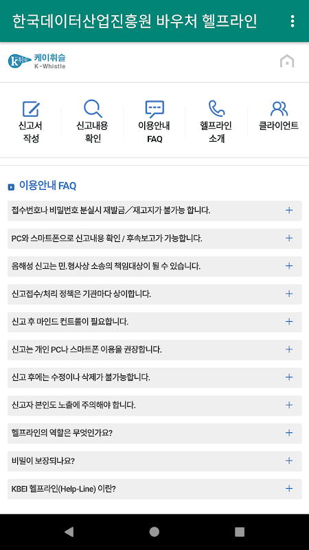 한국데이터산업진흥원 바우처 헬프라인은 해당 조직의 부정비리를 알고 있는 내부 임직원 혹은 외부 이해관계자가 안심하고 신고 할 수 있는 부정부패 신고 APP 입니다.