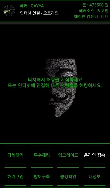해커온라인(Hacker Online)는 터치 형식 전략 게임입니다. 사이버넷에 접속해서 다른 해커들의 방어벽을 무너뜨려서 랜섬웨어를 심을 수 있으며, 해킹을 많이 해서 최대한 높은 랭킹에 등극하는 것에 집중해야 합니다. 사이버 넷에는 정과 사랑, 연민 같은 건 없습니다. 치명적인 해커들의 해킹 기술들과 해킹 코드들로 난무합니다. 사이버넷에서 믿을 수 있는 건 오직 자신뿐입니다.
