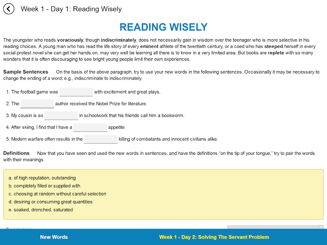 قوائم الكلمات والتعاريف ، تمارين القياس ، تمارين الكلمات في السياق.
