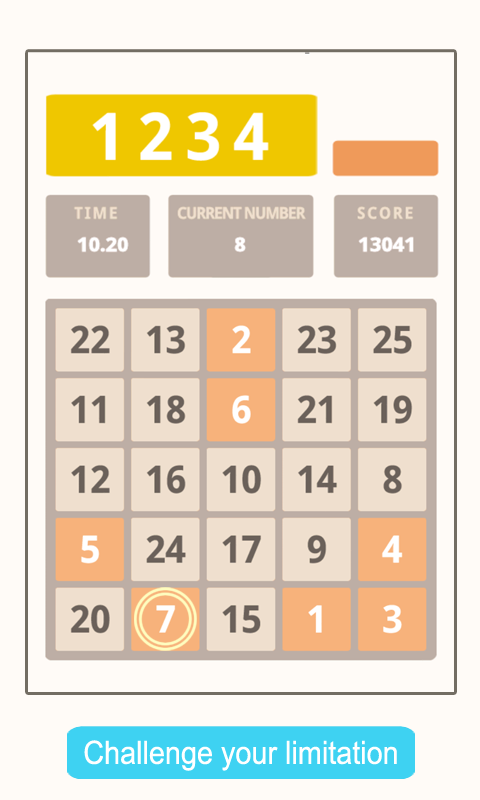 Find out numbers from 1 sequentially, and higher score will get with more accurate and faster clicks.