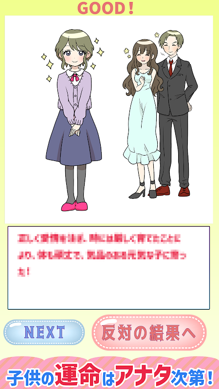 "Two Choice Yoshiyoshi Parenting Game" هي لعبة اختبار حيث يمكنك بسهولة تربية طفلك بخيارين وتعزيز القصة!
