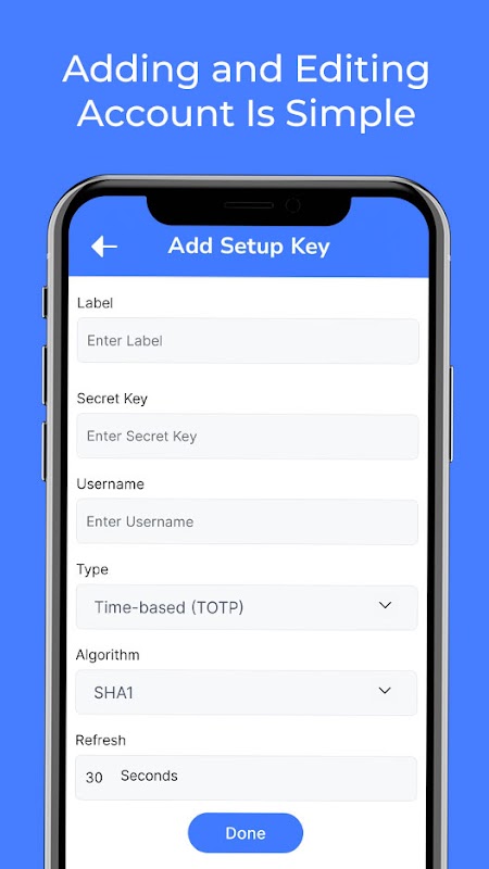 تتغير كلمة المرور لمرة واحدة (OTP) بناءً على الوقت بعد فترة زمنية محددة، وتتغير كلمة المرور لمرة واحدة بناءً على العداد عند الحاجة (عند التحديث). كما يوفر التطبيق خوارزميات SHA1 وSHA256 وSHA512 لأغراض أمنية.