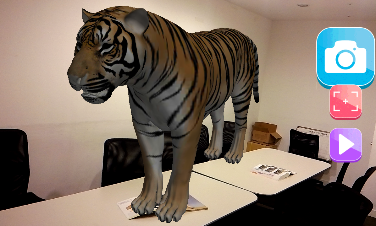 각 동물이 3D로 구현이 된다. 사진찍기- 초첨잡기-실제사이즈 버튼을 제공하며, 실제사이즈 버튼