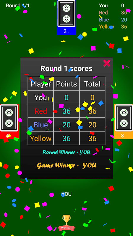 بعد الجولة الأخيرة، سيتم إعلان الفائز/الفائزين بناءً على إجمالي نقاط جميع الجولات. يفوز باللعبة اللاعب الذي يحصل على أقل عدد من النقاط.