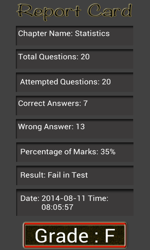 بطاقة التقرير: - بعد تشغيل الاختبارات القصيرة ، يمكنك رؤية بطاقة تقرير الأداء الخاصة بك استنادًا إلى نظام الدرجات ويمكنك أيضًا إرسال تقرير الأداء بالبريد إلى معلميك ووالديك وأصدقائك.