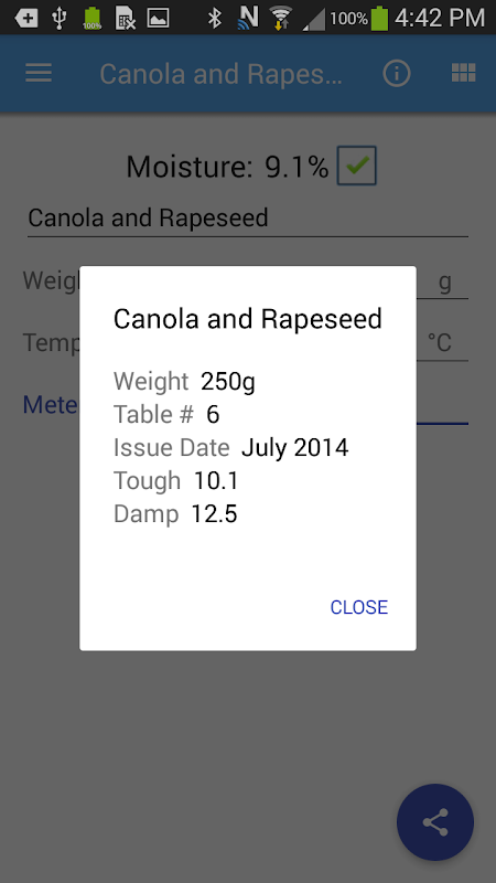 عند استخدام اختبار 919 الرطوبة للعثور على محتوى الرطوبة من الحبوب بدلا من صب عبر الجبال من الرسوم البيانية ببساطة إدخال القيم المقاسة في هذا التطبيق. حدد نوع الحبوب وإدخال درجة الحرارة والاتصال الهاتفي قراءة العداد من الخاص بك 919 اختبار الرطوبة وسوف يتم عرض محتوى الرطوبة لك. سيعرض التطبيق أيضا على ما إذا تعتبر الحبوب الخاصة بك جافة، صعبة، أو الرطب على أساس المواصفات التي وضعتها لجنة الحبوب الكندية.
