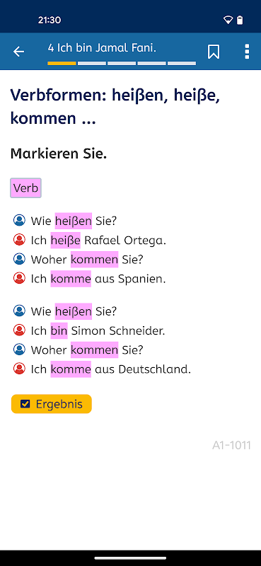 تعلم الألمانية بالمجان في المستوى A1. المستوى A1 للغة الألمانية هو نسخة الهاتف الجوال "لدورة اللغة الألمانية A1 على https://vhs-lernportal.de/deutsch. استخدم من خلال التطبيق كل وظائف "دورة اللغة الألمانية A1 بدون إنترنت أيضًا على هاتفك الذكي.