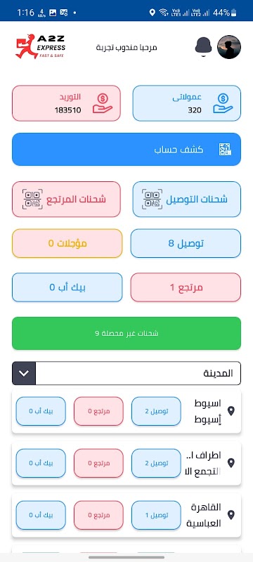 واجهة العميل يستطيع من خلال التطبيق اضافة الشحنات ومتابعة شحناته وحالتها وخط سير الشحنة ومتابعة ارصدته وحساباته