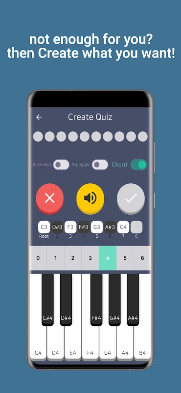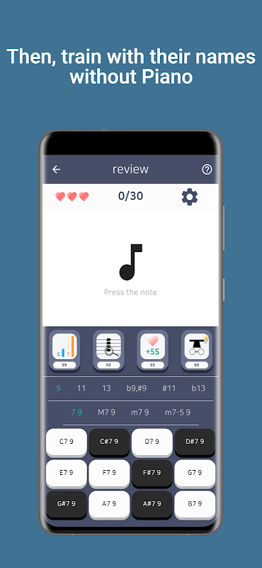 في وضع التدريب ، حسِّن مهارات الاستماع لديك تدريجيًا عن طريق مسح المراحل من Notes إلى Tension Chords و 251 Voicings و Mode Scales.