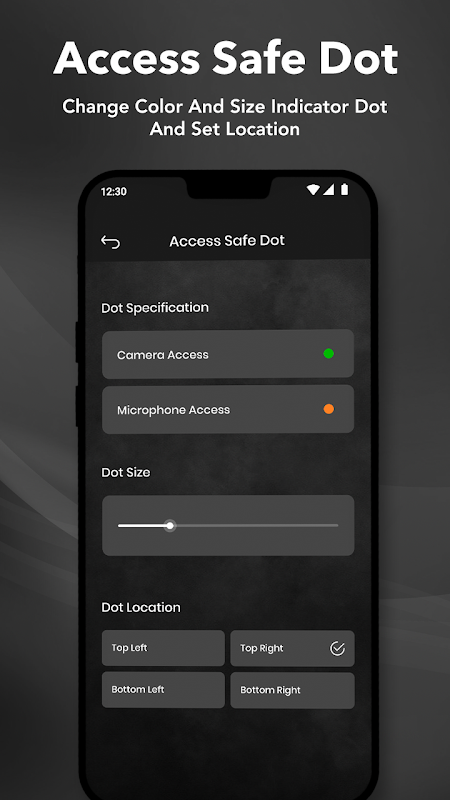 يعد تكوين التطبيق أمرًا بسيطًا مثل تمكين خدمة Access Dots Accessibility Service. تم تكوين التطبيق افتراضيًا لإظهار نقاط الوصول الملونة - الأخضر للوصول إلى الكاميرا والبرتقالي للوصول إلى الميكروفون. لا يطلب تطبيق Access Dots الآمن نفسه الوصول إلى الكاميرا أو الميكروفون.