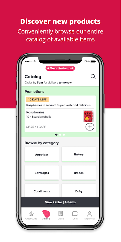 يتيح لك تطبيق الهاتف المحمول الخاص بنا البحث في كتالوج منتجاتنا الكامل وإدارة دليل الطلب الخاص بك وتحديثه وشراء ما تحتاجه في الوقت الذي تحتاجه فيه. إنه جزء من التزامنا بمنحك تجربة ترتيب ستحبها.