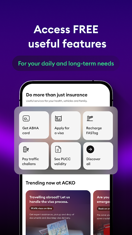 احصل على تطبيق ACKO لجميع احتياجاتك التأمينية والمتعلقة بالمركبات. سواءً كنت تبحث عن تأمين سيارة، أو دراجة نارية، أو تأمين صحي، أو تأمين على الحياة، أو تأمين سفر، فكل ما تحتاجه على بُعد خطوات قليلة. كما يمكنك الوصول إلى خدمات مفيدة متعلقة بالمركبات، مثل التحقق من مخالفات RTO، والبحث عن مخالفات إلكترونية، وإعادة شحن FASTag، والتحقق من انتهاء صلاحية PUC، كل ذلك في تطبيق واحد.