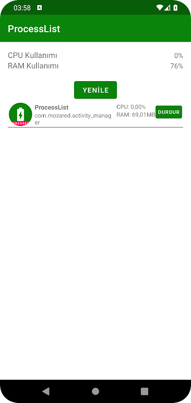 يعرض هذا التطبيق معلومات حول جميع التطبيقات التي تعمل على جهازك ، مثل استخدام وحدة المعالجة المركزية واستخدام ذاكرة الوصول العشوائي واسم الحزمة واسم التطبيق والرمز والمزيد. تحتوي الشاشة الرئيسية على قائمة قابلة للتمرير لجميع التطبيقات بالترتيب ، إلى جانب زر التحديث. عندما تضغط على زر الإغلاق بجوار أي تطبيق في القائمة ، سيتم إغلاق التطبيق. في الجزء العلوي من الشاشة ، يمكنك رؤية ذاكرة الوصول العشوائي في الوقت الحقيقي واستخدام وحدة المعالجة المركزية لجهازك.
