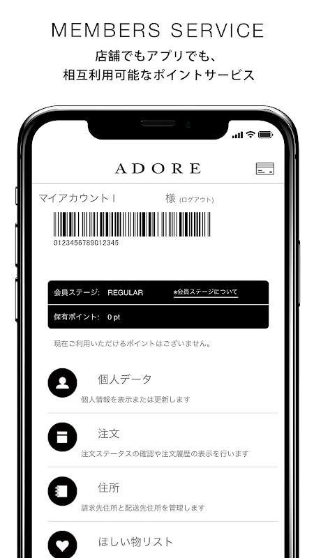 التطبيق الرسمي للطلب عبر البريد لشركة ADORE، وهي ماركة أزياء فاخرة للنساء البالغات. يمكنك استخدامها كبطاقة عضو وكذلك التحقق من نقاطك.