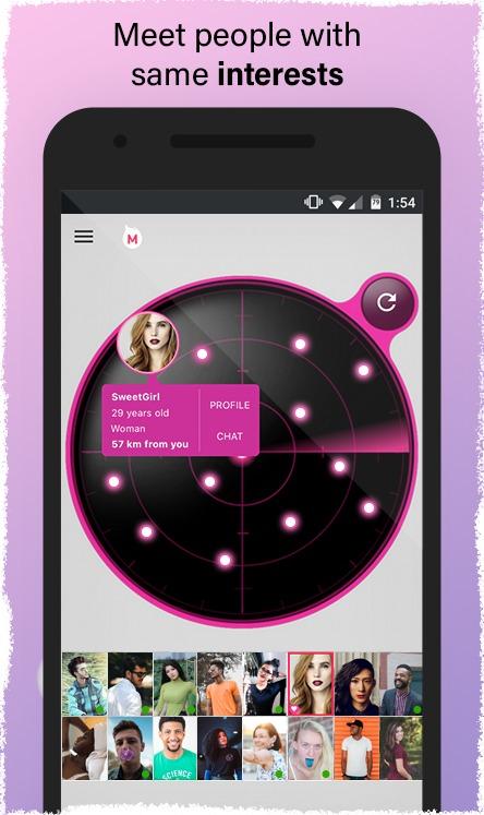 The app has a high-tech radar that displays the closest and farthest people from you. You can choose one profile by clicking on radar pulses or on the photos at the bottom of the screen. In both cases you will see the pictures and distance of the users.