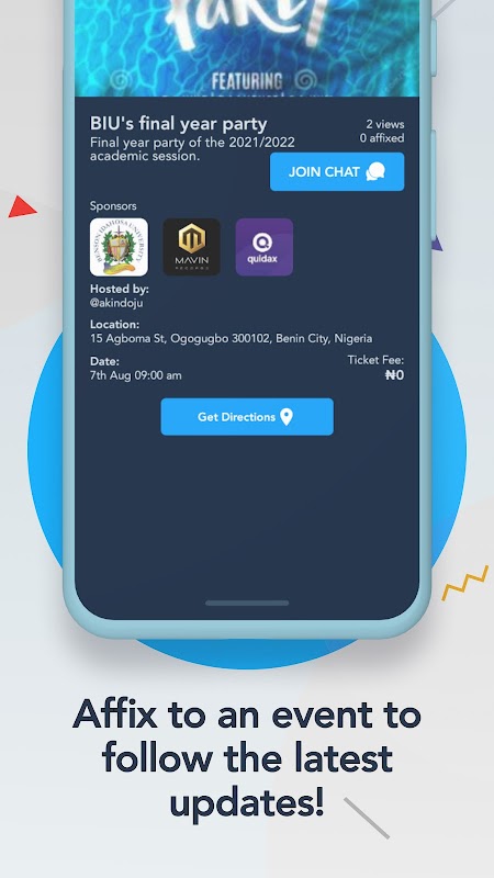 يمكن أن تكون الأحداث عبر الإنترنت أو مادية ويمكنك تنسيق جميع جوانب الأحداث الخاصة بك على Affixdot. تم تصميم هذه المنصة لجذب الأشخاص المهتمين على وجه التحديد بمكانة الحدث الخاص بك وبالتالي تحسين الجودة وتجربة المجتمع الشاملة خلال هذه الأحداث.