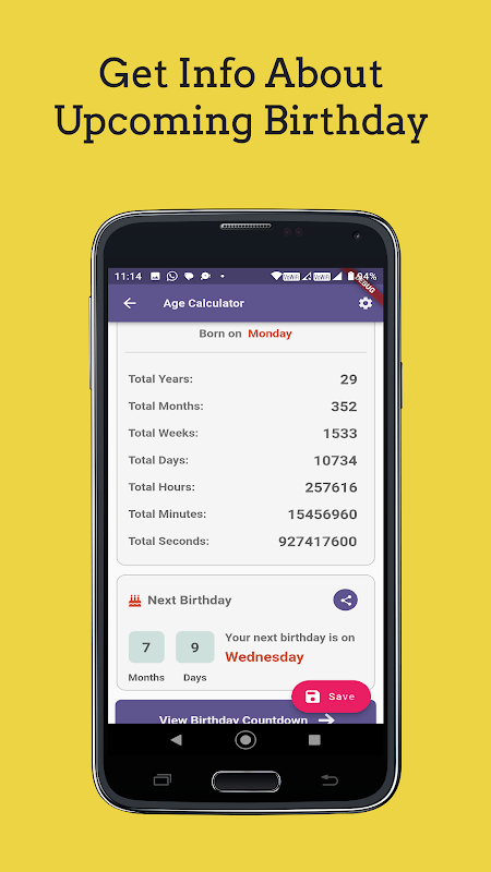 تعد ميزة التذكير بعيد الميلاد التالي مفيدة بشكل لا يصدق لأولئك الذين يميلون إلى نسيان التواريخ المهمة. بمجرد إدخال تاريخ ميلادك في التطبيق، فإنه يعرض الأشهر والأيام المتبقية لعيد ميلادك القادم ويساعدك على البقاء على علم باقتراب التاريخ، مما يضمن أن لديك ما يكفي من الوقت للتخطيط والاحتفال برحلة أخرى حول الشمس.