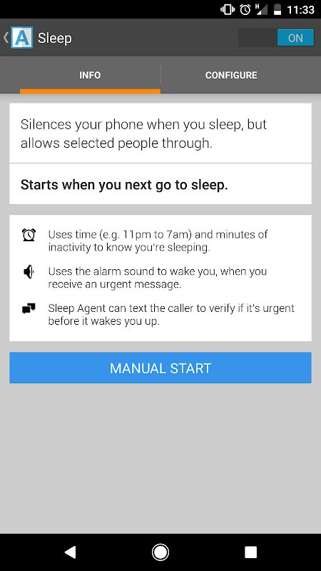 ★ Sleep Agent will silence your phone automatically when you go to sleep. You can configure sleep times for different days of the week, minutes of inactivity before activating, auto response to selected callers and texters during your sleeping hours, list of contacts that can wake you & Bluetooth, autosync, wifi and mobile data deactivation.