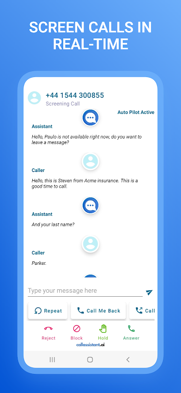• الطيار الآلي: دع مساعدنا الذي يعمل بالذكاء الاصطناعي يتعامل مع المكالمات الروتينية ، ويجمع المعلومات ، ويقدم الردود ، مما يوفر لك الوقت والجهد أثناء المحادثات الهاتفية.