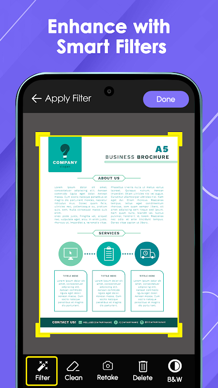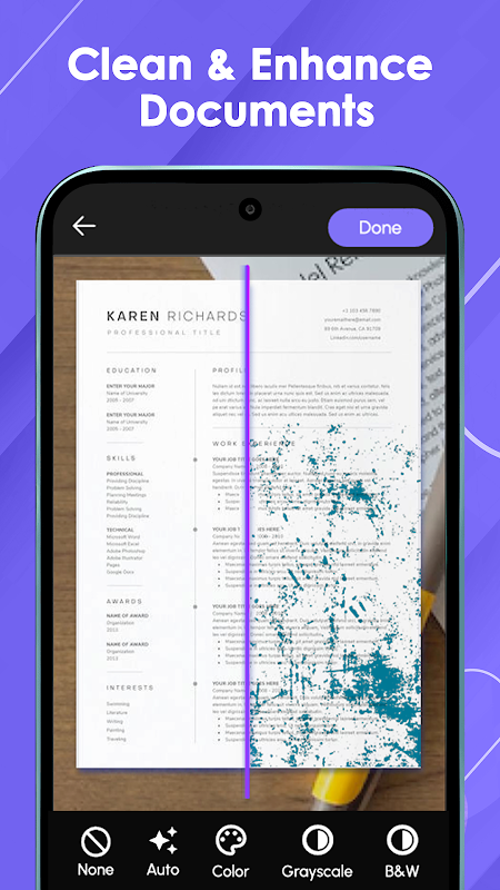 ودّع ارتعاش اليدين والإضاءة الضعيفة. يكتشف التطبيق مستندك تلقائيًا، ويحاذي الحدود بدقة، ويقص تلقائيًا، ويوفر ميزات تحرير لإزالة البقع، وإزالة الظلال، وتطبيق الفلاتر. كأنك تحمل ماسحًا ضوئيًا ذكيًا على مكتبك!