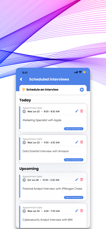 ابق منظمًا دون عناء طوال عملية المقابلة الخاصة بك من خلال ميزة الجدولة البديهية لدينا. تابع المقابلات القادمة والمواعيد النهائية الحاسمة، مما يضمن عدم تفويت أي شيء في رحلة البحث عن وظيفة.