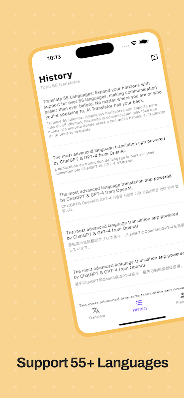 مترجم AI مدعوم من ChatGPT و GPT-4 من OpenAI ، عبر 55 لغة.