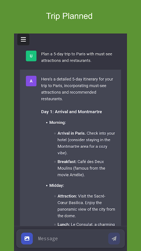 اجعل تخطيط سفرك خاليًا من التوتر ومثيرًا باستخدام AI Trip Planner، التطبيق الأمثل لإنشاء مسارات سفر مخصصة وفعالة. سواء كنت تستكشف مدينة جديدة، أو تخطط لإجازة عائلية، أو تنظم رحلة عمل، فإن هذا التطبيق يوفر كل ما تحتاجه لتصميم تجربة السفر المثالية.