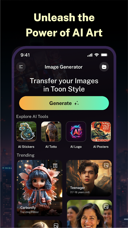 مع مُولّد صورنا القوي بتقنية الذكاء الاصطناعي، يمكنك بسهولة إنشاء أعمال فنية رائعة لرسومات الأنمي، ودعوات الأعياد، وتصميمات رقمية رائعة. هل تبحث عن مُحسّن صور أو مُنشئ صور بتقنية الذكاء الاصطناعي لتحويل صورك الشخصية إلى صور أنمي أو كرتونية؟ هذا التطبيق هو ساحة إبداعك المثالية!