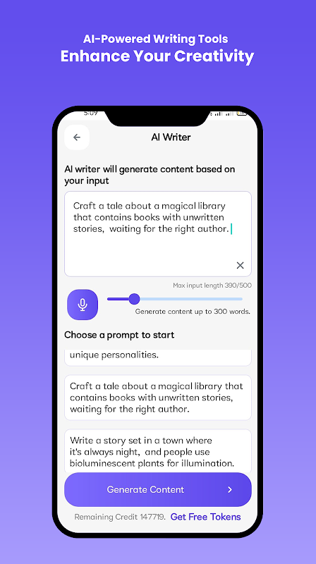 باستخدام AI Writer، يمكنك توليد أفكار وطرح أفكار لموضوعات جديدة، كل ذلك مع الاستفادة من خوارزميات معالجة اللغة الطبيعية المتقدمة التي تحلل أسلوبك في الكتابة وتقترح التحسينات. سواء كنت تكتب منشورات خيالية أو واقعية أو منشورات مدونة، يوفر تطبيقنا مجموعة من المطالبات والقوالب الخاصة بالكتابة لمساعدتك على البدء.