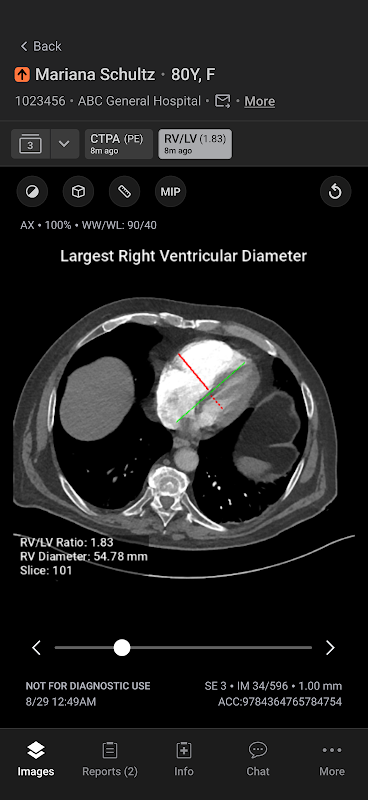 يعمل تطبيق اتصالات الهاتف المحمول Aidoc على تبسيط الاتصالات لتسريع عملية اتخاذ القرارات الحساسة للوقت وتحسين جودة الرعاية. يوفر التطبيق تحديد الأولويات المستندة إلى الذكاء الاصطناعي والإخطار بمجموعة واسعة من الأمراض الحادة بما في ذلك انسداد الأوعية الكبيرة والانسداد الرئوي.