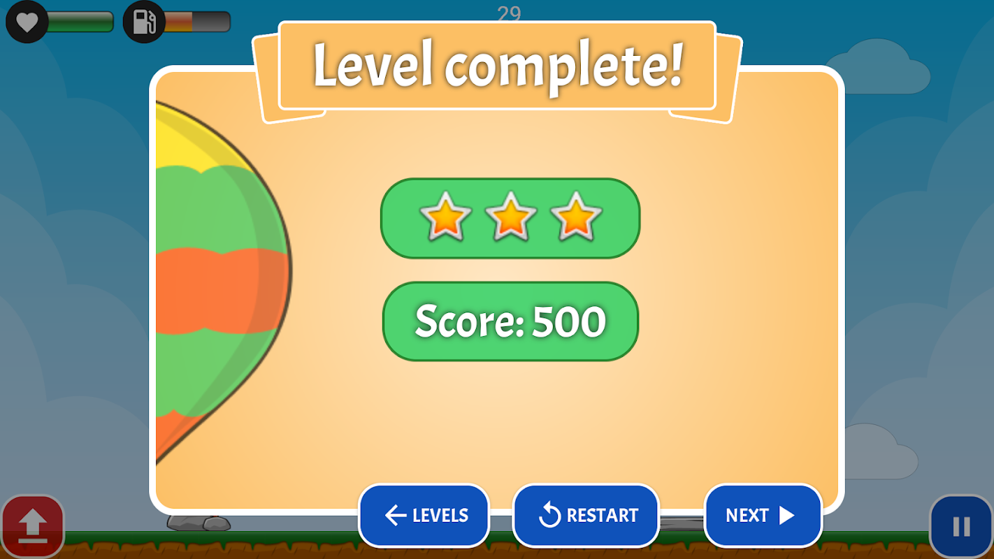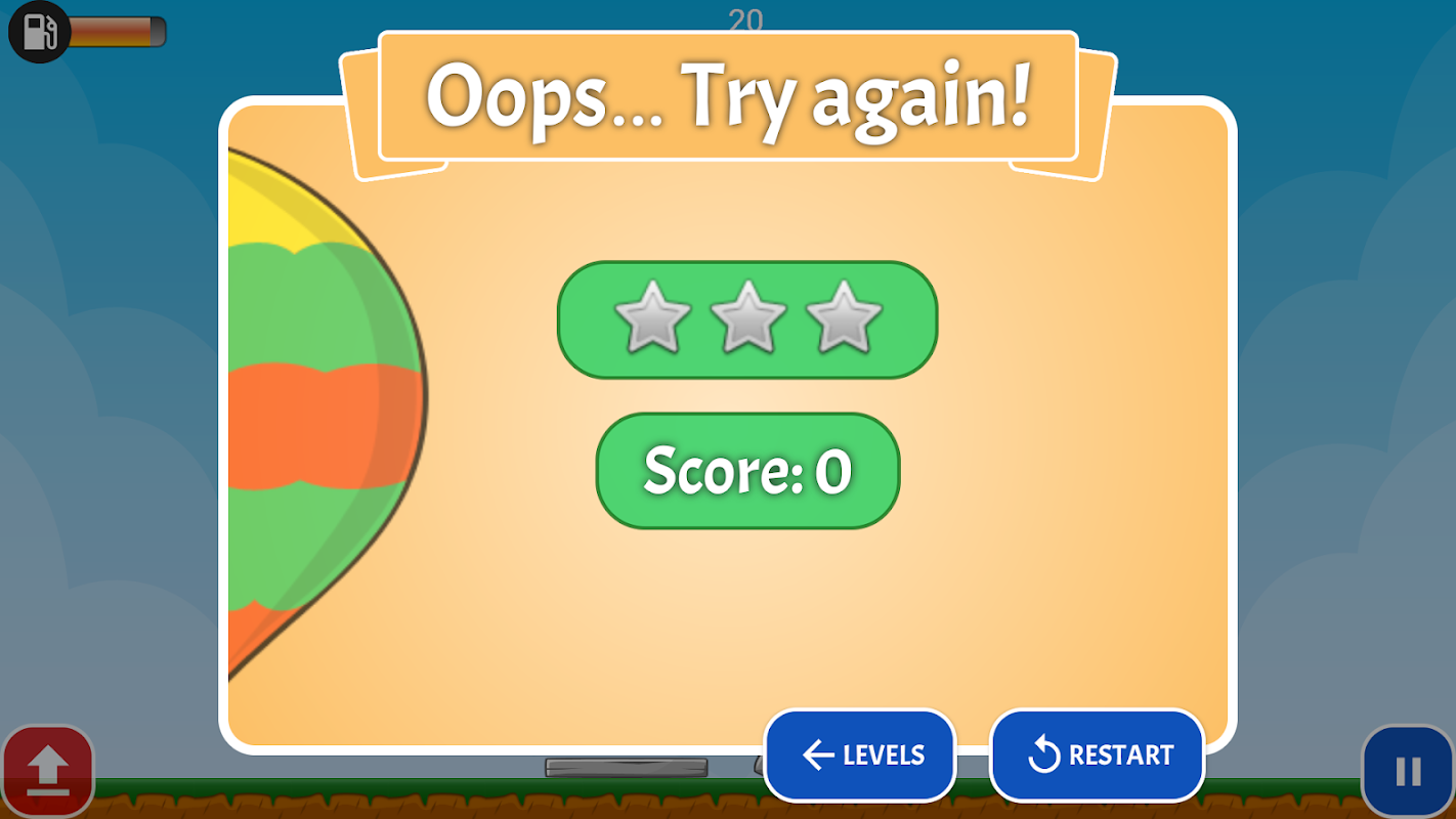 يحتوي المنطاد على كمية محدودة من الوقود للموقد. إذا نفد الوقود، سيبرد الهواء الساخن داخل غلاف المنطاد، وستعيد الجاذبية المنطاد إلى سطح الأرض. في هذه الحالة، يجب أن تكون محظوظًا جدًا لتهبط على منصة الهبوط. إذا هبطت خارج القاعدة، تنتهي اللعبة وعليك إعادة المحاولة.