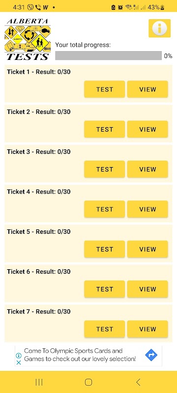 لبدء الاختبار اضغط على الزر "ابدأ" في قائمة التذاكر. لمراجعة إجاباتك أو العثور على الإجابات الصحيحة اضغط على زر عرض. سيتم تمييز الإجابات الصحيحة باللون الأخضر، وسيتم تمييز الإجابات غير الصحيحة باللون الأحمر. يحسب التطبيق تقدمك بناءً على الإجابات الصحيحة، ومن ثم يمكنك رؤيته في الجزء العلوي من شاشتك. بعد ذلك سيصل تقدمك إلى 100% - تأكد من أنك جاهز للاختبار الحقيقي. يمكنك أن تأخذ أي تذكرة عدة مرات حتى الآن حتى تحصل على جميع الأسئلة الصحيحة.