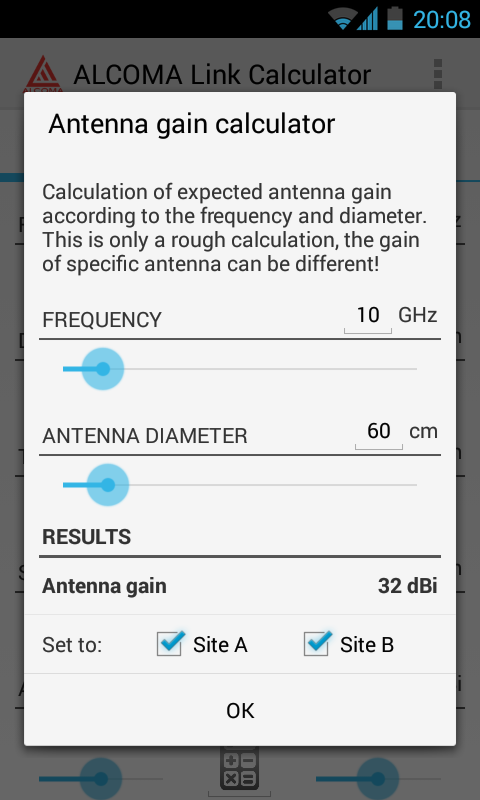 ALCOMA رابط حاسبة هو أداة مفيدة لتركيب الميكروويف من نقطة إلى نقطة الوصلات. أنه يحتوي على تتلاشى هامش آلة حاسبة، RX مستوى آلة حاسبة أو كسب الهوائي آلة حاسبة لفرق ترانزستور Freqency تصل إلى 80 غيغاهيرتز. فإنه يشمل أيضا قاعدة بيانات من الروابط ALCOMA الميكروويف مع جميع المعلمات اللازمة لحساب - الحساسيات عتبة، ومعدلات نقل أو مكاسب الهوائي.