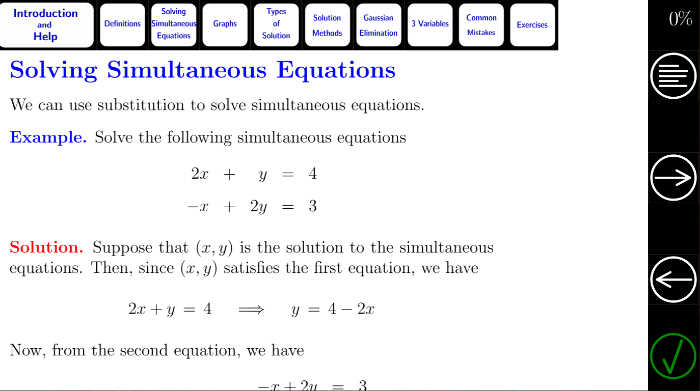 * Studying mathematics is best done by working through examples and exercises. There are many interactive examples and exercises in this tutorial that must be completed to achieve 100% progress.