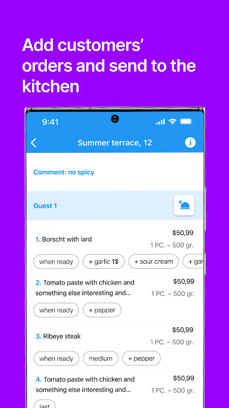 تطبيق للنادل. استلام الطلب. الإخطارات من المطبخ. الإخطارات من العميل. الترجمة التلقائية لجميع الرسائل. إيصال دفع الحساب. التطبيق ينتمي إلى نظام إدارة مطاعم Neon Alisa.