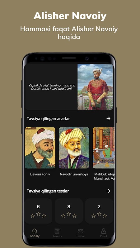 Bu dastur sizga buyuk shoir va mutafakir Alisher Navoiy asarlarini o'qish hamda u haqidagi qiziqarli testlarni ishlash imkonini beradi.