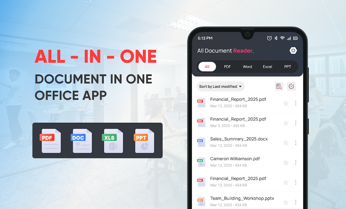يساعدك تطبيق All Document - File Reader على عرض الملفات وتنظيمها وتحويلها بتنسيقات متعددة، بما في ذلك PDF وWord وExcel وPowerPoint وغيرها.