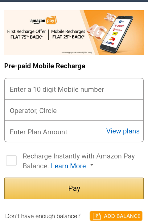 Go cashless with Amazon Pay. You can pay mobile recharge,